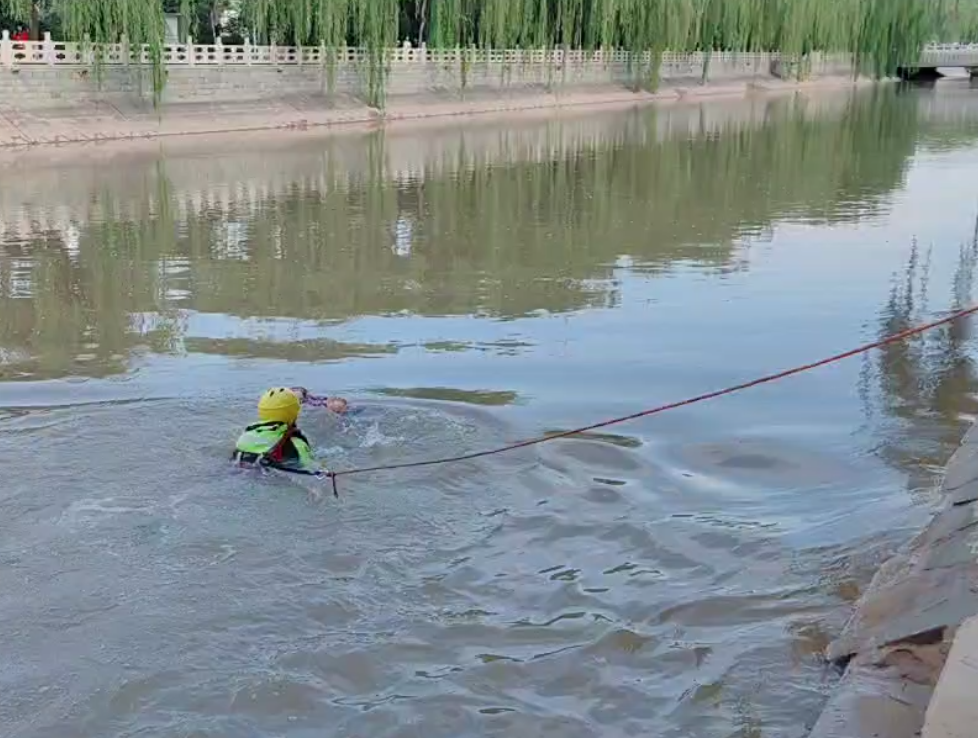 穿着水域救援服的消防员做好安全防护措施后,立即入水实施营救,岸上其余消防员配合进行收绳,随后落水人员被成功营救上岸,落水者意识清醒。