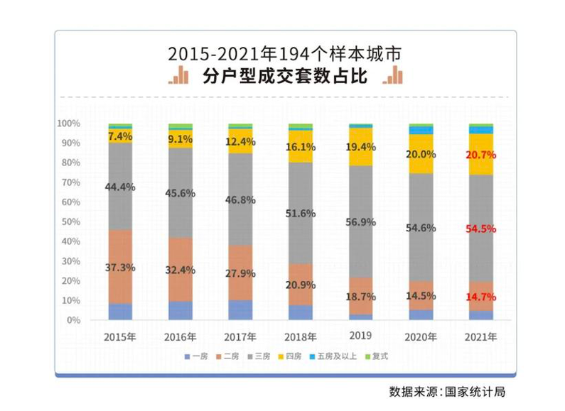 受限贷政策影响,大量改善性需求被压制。2021年,改善性需求相对坚挺,据CRIC重点监测的 194个样本城市成交结构数据显示,三房成交套数占比高达54.5%,四房成交占比稳步提升至20.7%。但受限贷政策影响,不少城市二套房首付比例都在50%以上,部分城市更是达到70%乃至80%。