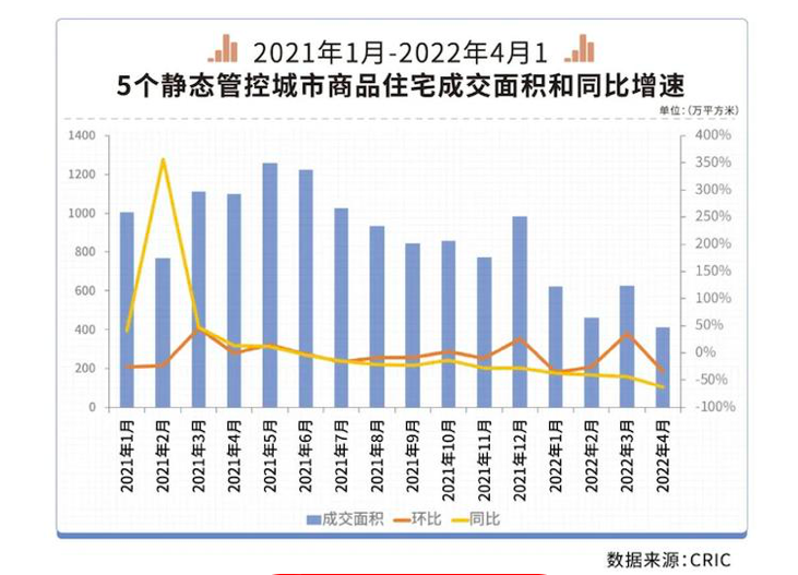 4月,15个静态管控城市商品住宅成交面积414万平方米,创近年来单月新低,环比下降34%,同比跌幅扩至62%。