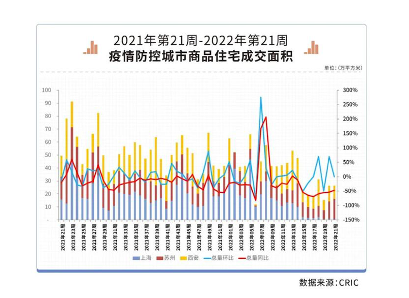 从21周(5.16-5.22)成交数据来看,3个尚在静态管控中的城市,新房成交面积共计26万平方米,环比基本持平,同比仍下降47%。其中,上海房地产市场继续停摆,成交近乎归零。