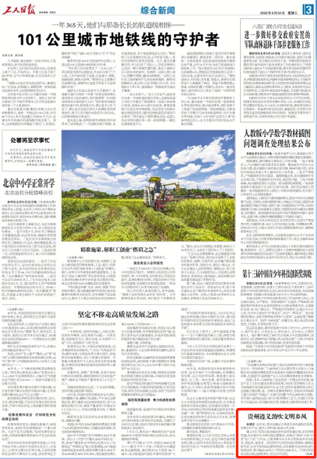 今天(8月23日),《工人日报》刊发新闻《贵州遵义劲吹文明乡风》。