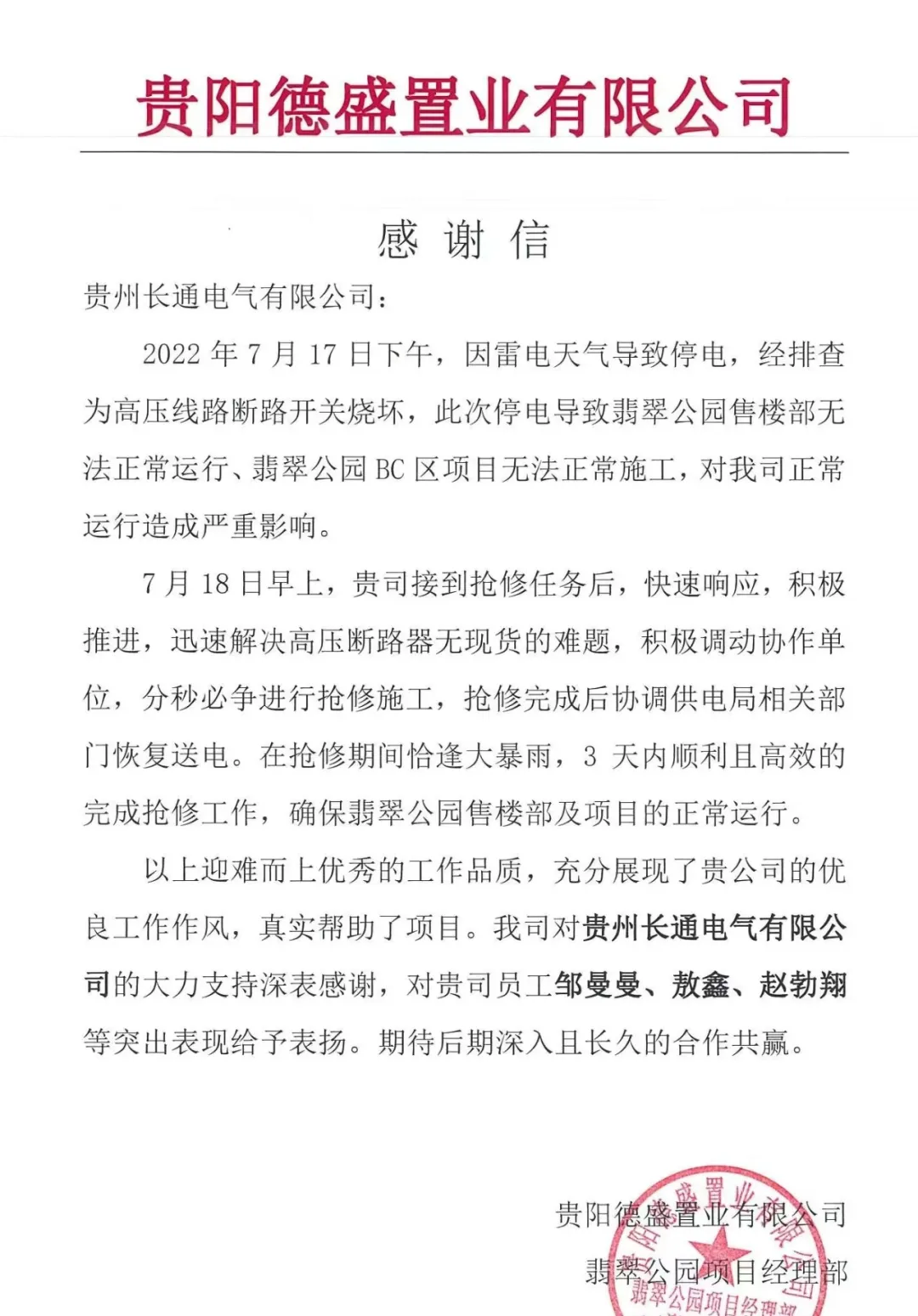 贵阳德盛置业有限公司由此向贵州长通集团发去感谢信。