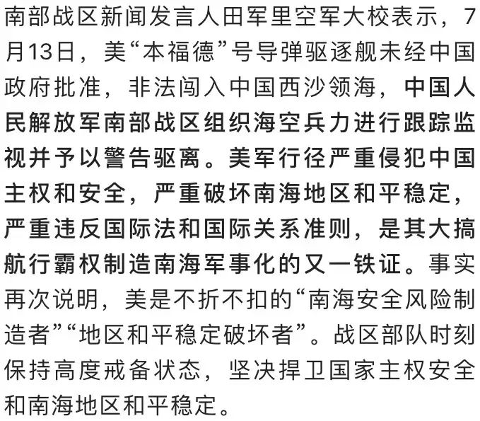7月13日,美海军“本福德”号导弹驱逐舰非法闯入中国西沙领海