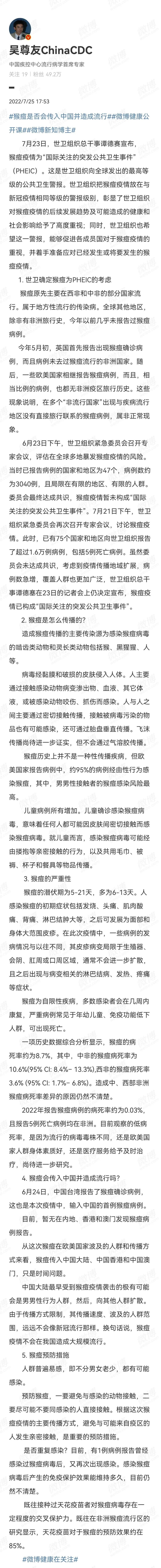 7月25日,中国疾控中心流行病学首席专家吴尊友发文解读猴痘: