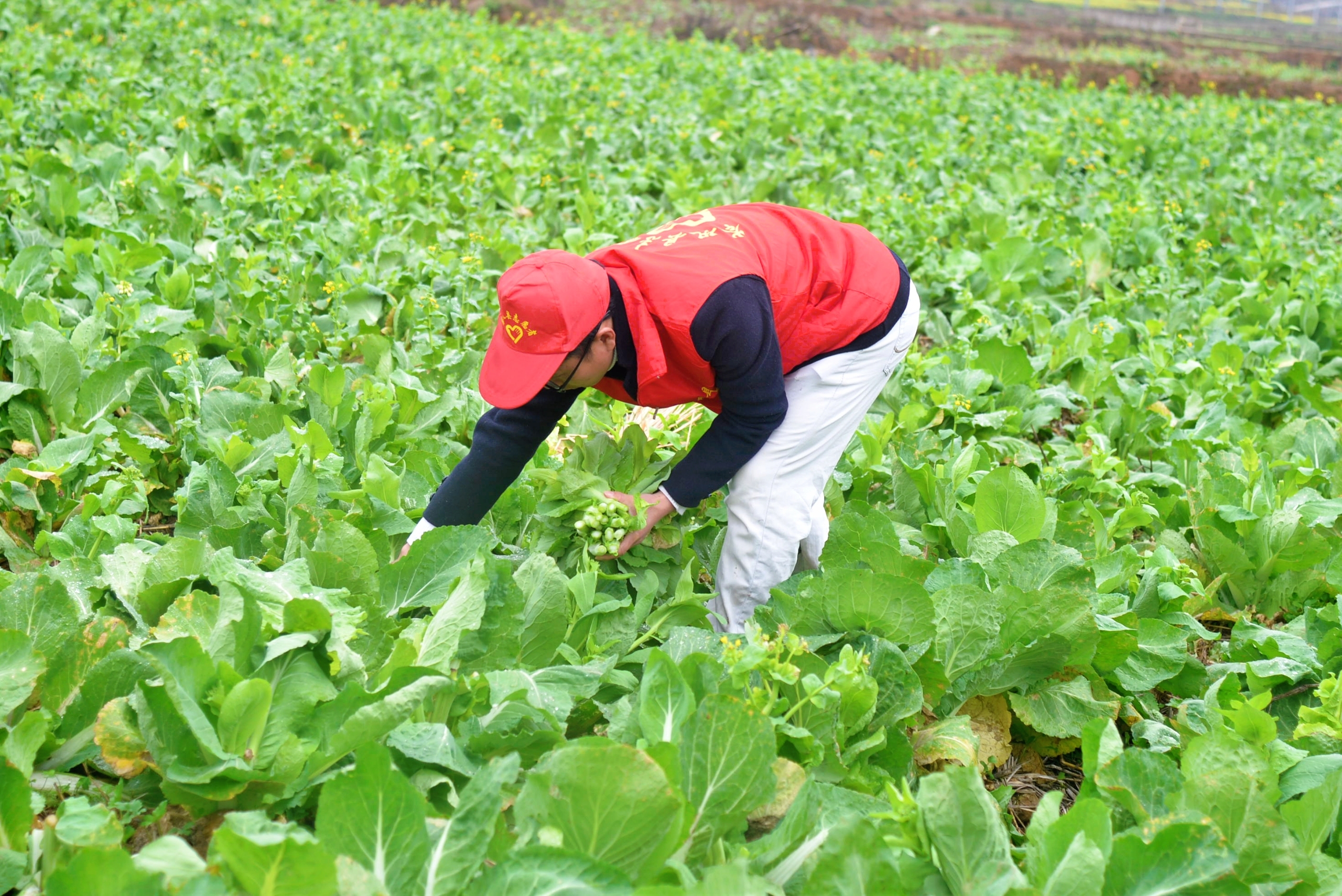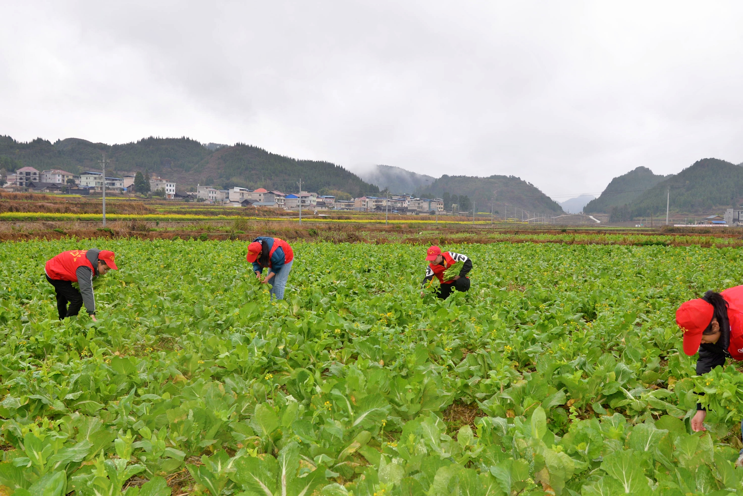 眼下正值白菜薹丰收的季节,在贵州省黔东南州岑巩县羊桥乡龙湾村,一望无际的蔬菜基地里,一颗颗绿油油的白菜薹长势旺盛,党员志愿者和村民们正紧抓有利时节,抢收白菜薹,摘菜、分拣、打包、装车,大家忙得不亦乐乎。