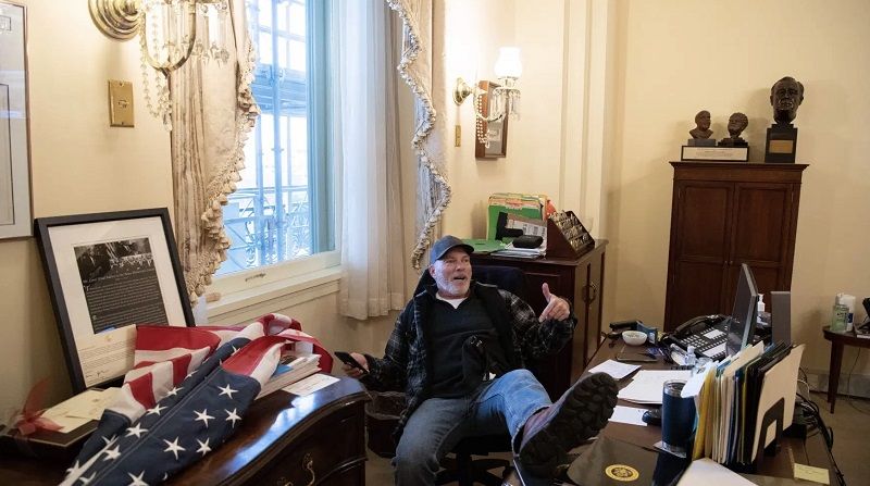 巴内特在国会山骚乱期间闯入佩洛西办公室,还将脚搭在她的办公桌上。他在今年早些时候被判妨碍公务、扰乱社会秩序和偷窃政府财物等8项罪名成立。