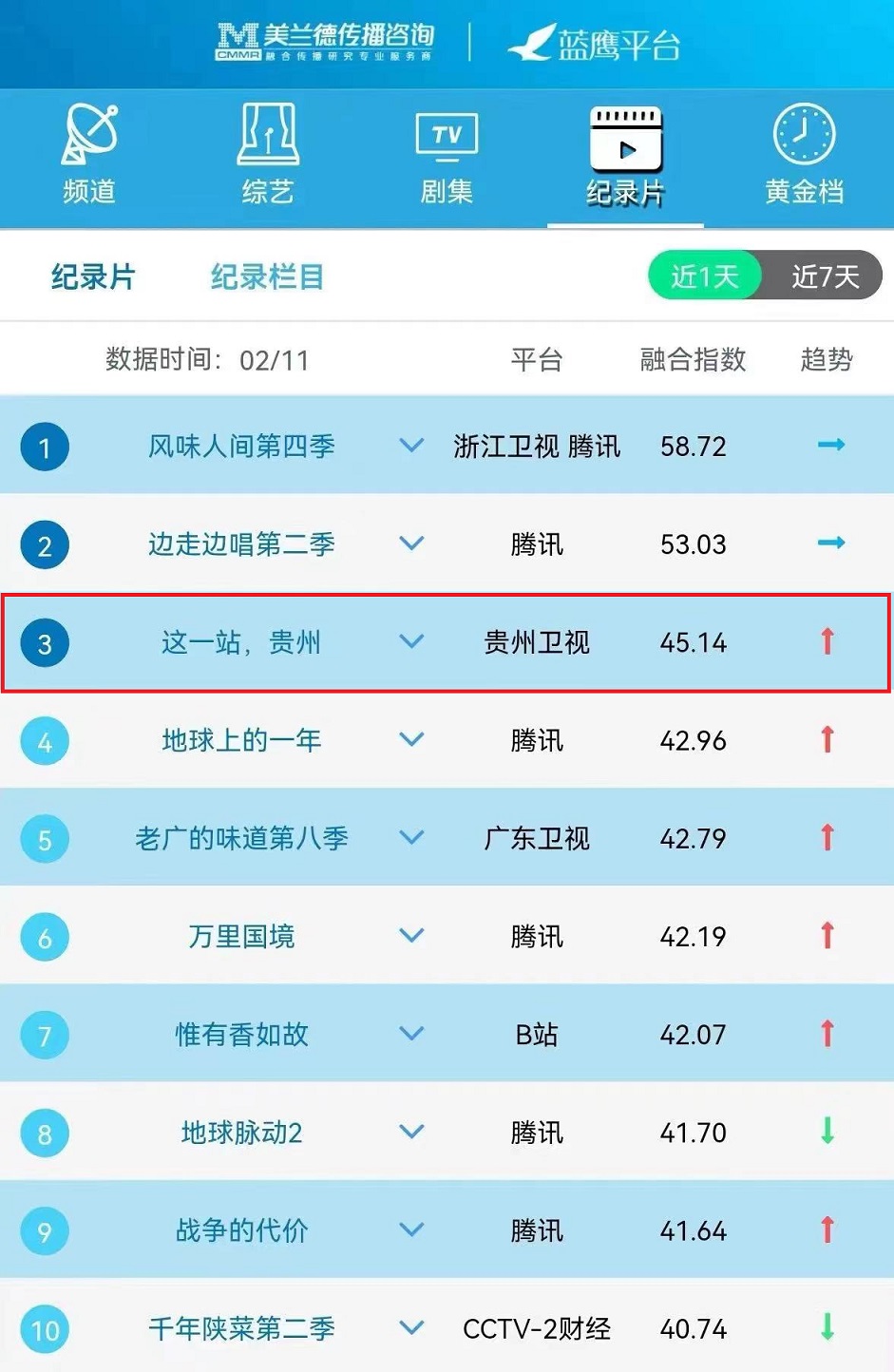 纪录片《这一站,贵州》共八集,目前已接近尾声。从第一集的“山”到第七集“歌”,《这一站,贵州》内容扎实,质量过硬,以始终如一的品质,稳定在美兰德蓝鹰融合传播指数榜。