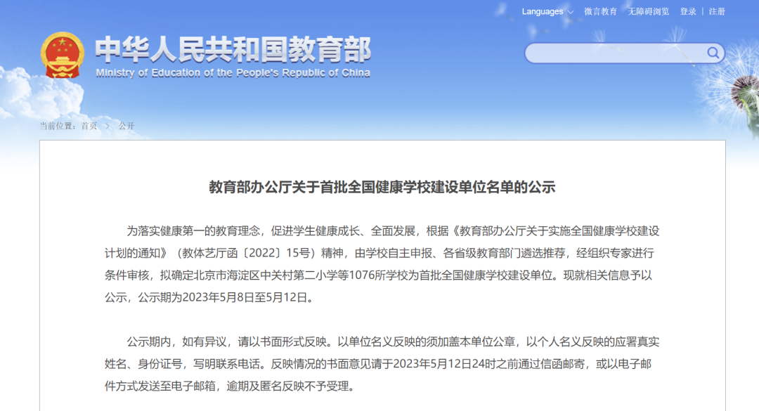 近日,教育部公示首批全国健康学校建设单位名单,拟确定北京市海淀区中关村第二小学等1076所学校为首批全国健康学校建设单位。公示期为2023年5月8日至5月12日。一起来看↓↓↓