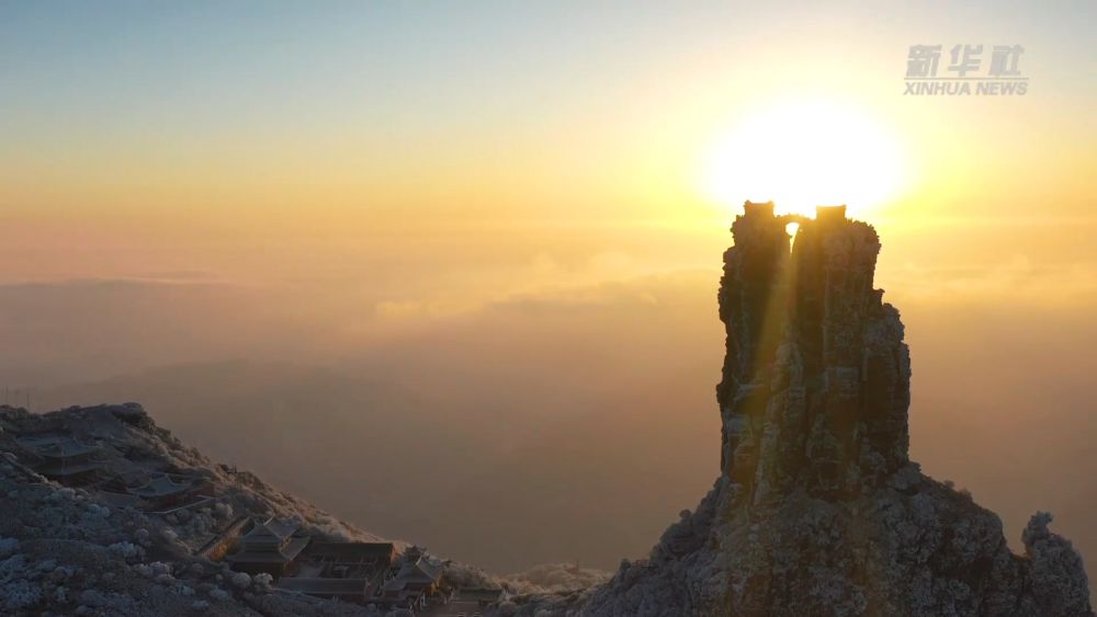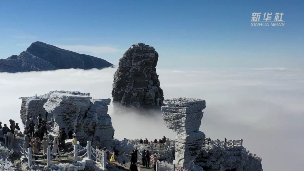 近日,大雪后的世界自然遗产地梵净山,迎来晴好天气。金顶之下,阳光普照,云雾蒸腾弥漫,宛如仙境。上山的游客陶醉其间,流连忘返。