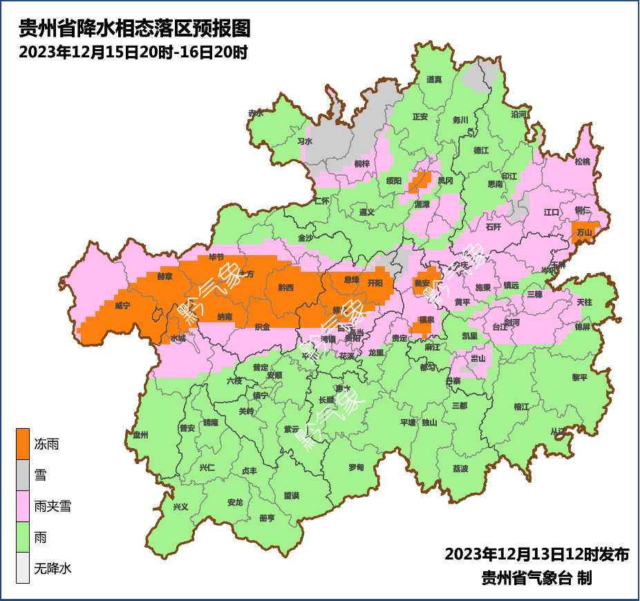 雨雪方面,15日夜间至16日白天,省的中部地区东西向一线有冻雨或雨夹雪,北部高海拔地区有小雪,中北部地势高处或高山地区伴有电线覆冰和道路结冰;16日夜间,雨雪天气减弱,省的西部高海拔地区有零星冻雨或雨夹雪;17日夜间,省的东北部地区仍有雨夹雪或小雪,中部地势高处有冻雨。