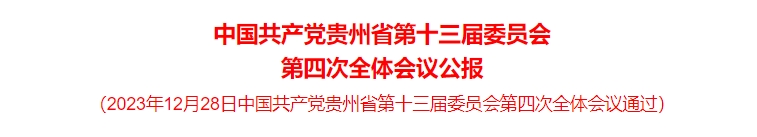 中国共产党贵州省第十三届委员会第四次全体会议,于2023年12月28日在贵阳举行。省委委员67人、候补委员7人出席会议。省纪委委员和有关方面负责同志,党的二十大代表中的部分基层代表、省第十三次党代会代表中的部分基层代表等列席会议。