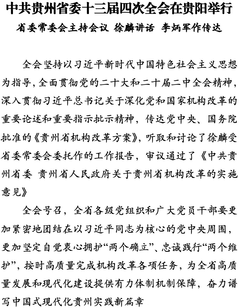 全会由省委常委会主持。省委书记徐麟受省委常委会委托作工作报告,就《中共贵州省委 贵州省人民政府关于贵州省机构改革的实施意见(讨论稿)》作说明,并作总结讲话。全会听取和讨论了徐麟同志作的工作报告和说明,审议通过了《中共贵州省委 贵州省人民政府关于贵州省机构改革的实施意见》。省委副书记、省长李炳军传达党中央、国务院批准的《贵州省机构改革方案》。