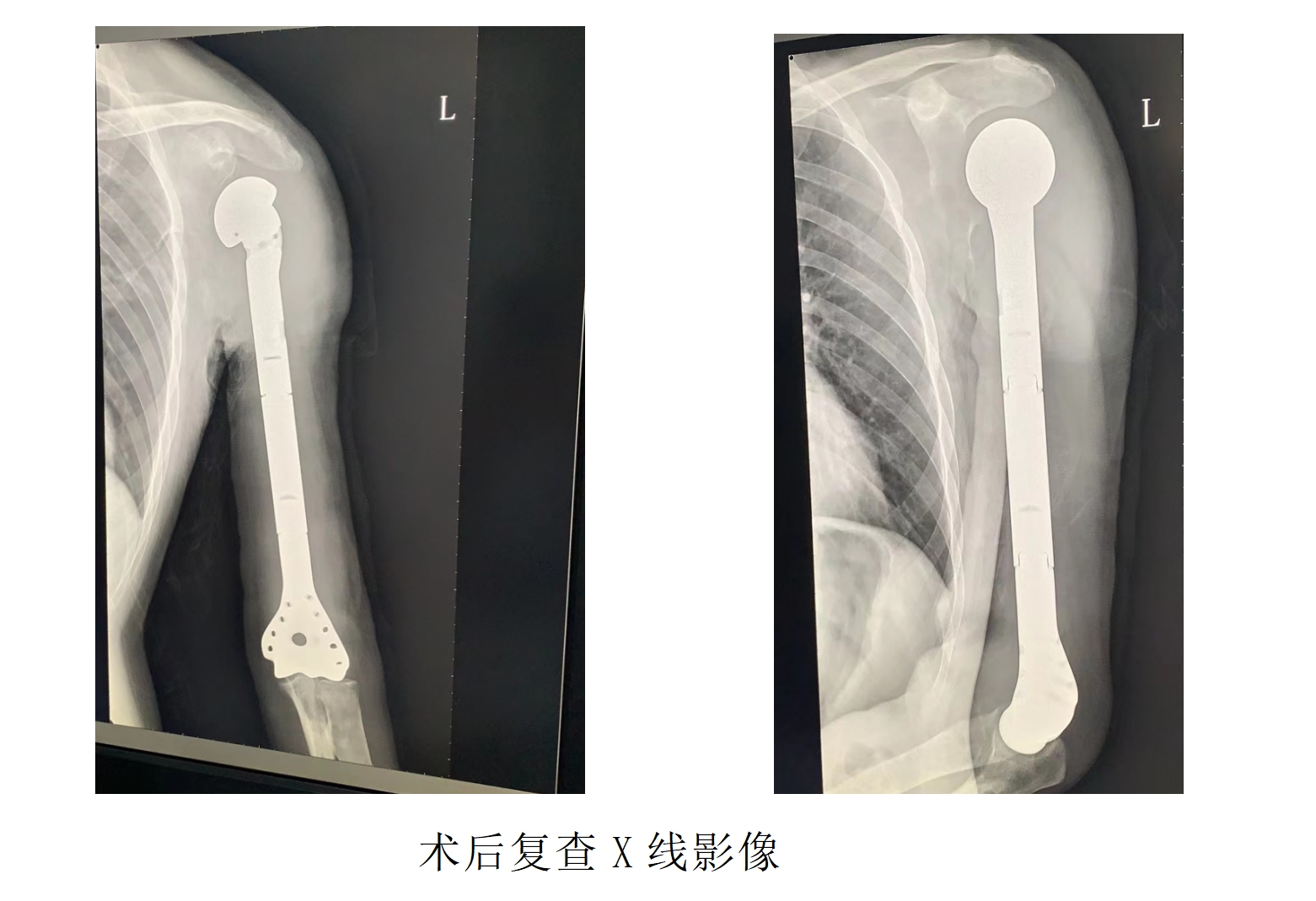 术前,骨科骨肿瘤团队为刘华精确测量了肱骨及肩、肘关节径线、角度,定制了人工假体等。手术当日,骨科骨肿瘤团队与麻醉科、手术室、影像科等多学科医护人员携手合作,历经3个小时,成功为刘华完成了3D打印仿生型全肱骨置换手术,术中有效重建了伸肌群及屈肌群。