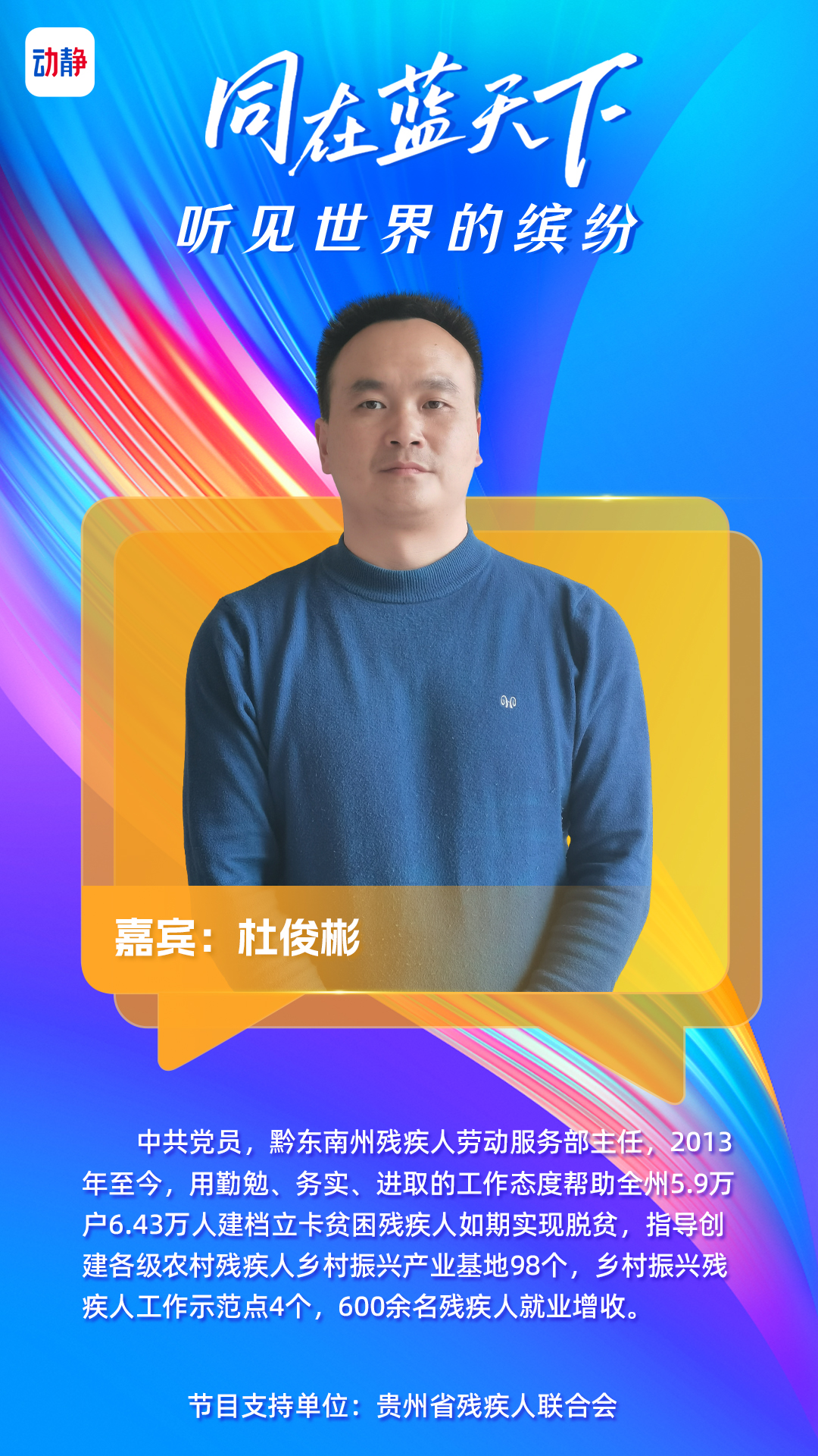 贵州广播电视台联合贵州省残疾人联合会推出系列节目《同在蓝天下•听见世界的缤纷》,本期专访黔东南州残疾人劳动服务部主任杜俊彬。