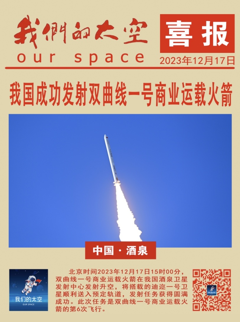 北京时间2023年12月17日15时00分,双曲线一号商业运载火箭在我国酒泉卫星发射中心发射升空,将搭载的迪迩一号卫星顺利送入预定轨道,发射任务获得圆满成功。