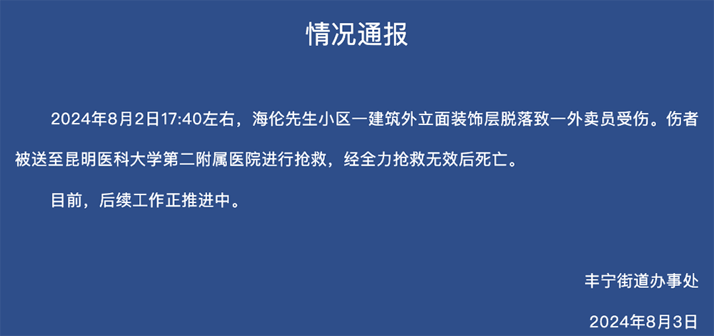8月2日,云南昆明一小区发生建筑外立面装饰层脱落砸伤外卖员事件,引发关注。