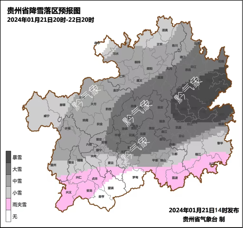 天气预报:今天夜间开始全省大部分地区雨转雪,降雪将持续至明天上午,降雪量级普遍达中雪以上,其中铜仁市东部及南部、黔东南州大部、黔南州中北部、贵阳市、遵义市东南部、安顺市北部有大雪或暴雪,积雪深度1~5厘米,局部可达5~8厘米,少数高海拔地区可达10厘米以上。