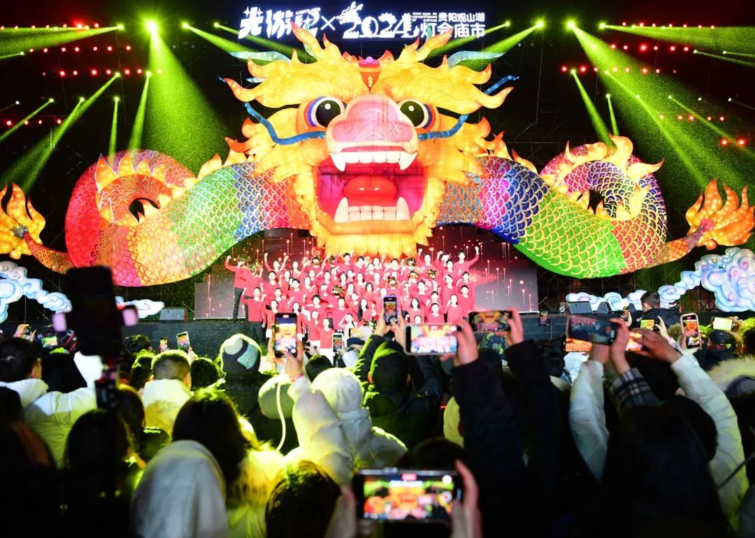 据主办方介绍,2024贵阳观山湖灯会庙市不仅是一场规模空前的灯光盛宴,更是一次融合多元文化的贵州新年大联欢,为游客呈现充满创意、美食与文化的综合体验,让游客在观山湖灯会庙市中领略到高水平的演艺表演,感受浓厚的贵州年俗文化,共同迎接新年的到来。