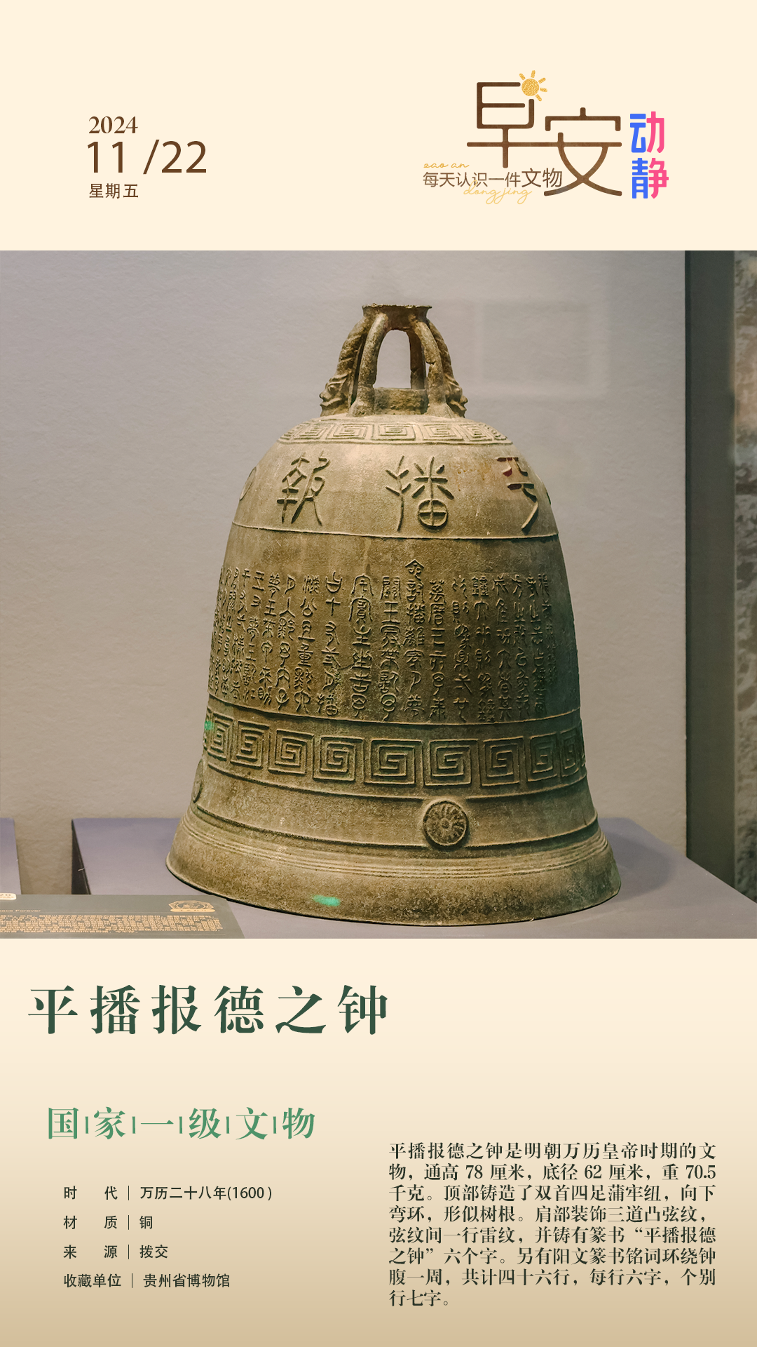 平播报德之钟是为铭记明朝平定播州土司杨应龙反叛这一重大历史事件而铸造。播州之役历时 114 天,明王朝集四川、贵州、湖广八省之力,出兵 24 万,耗银约二百余万两才最终平定杨氏叛乱。此钟见证了明朝加强对西南地区统治的重要历史进程,是 “万历三大征” 中播州之役的重要实物见证,对研究明朝的军事、政治以及民族政策等都有重要意义。