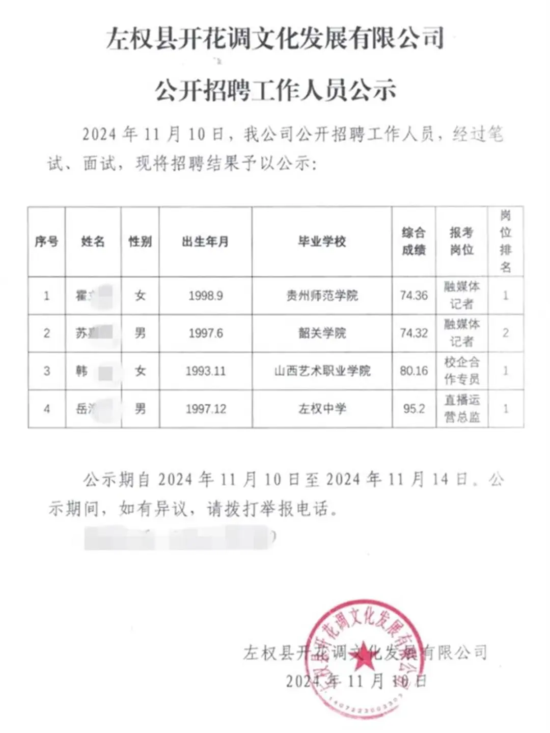 11月10日,“左权融媒”公众号发布《左权县开花调文化发展有限公司公开招聘工作人员公示》,公示了开花调公司拟聘用的4名工作人员。其中有一位名叫岳某的27岁男子,毕业学校是左权中学,聘用岗位为直播运营总监。此事引发网友争议:国企聘用一名只有中学文凭的人员为总监,是否有猫腻?还有网友表示,该公司在招聘时,曾明确要求学历为大专及以上。