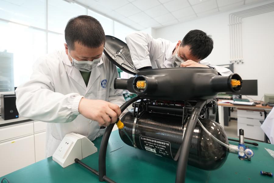 科研人员在为无人机装配高比能氢混动力电源。新华社记者 潘昱龙 摄