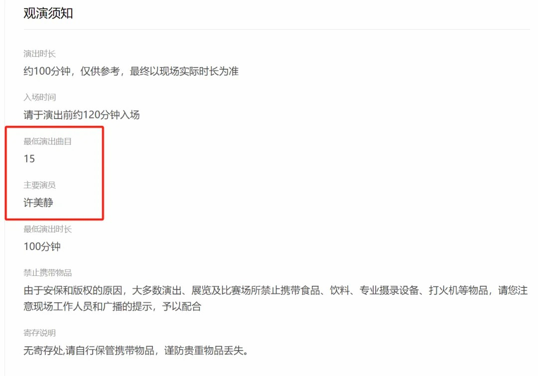 在大麦网的观演须知中,可以明确看到最低演出曲目为15首,主要演员为许美静,最低演出时长为100分钟。