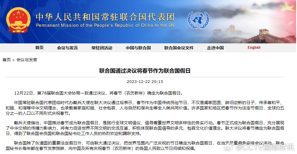 22日,第78届联合国大会协商一致通过决议,将春节(农历新年)确定为联合国假日。中国常驻联合国代表团临时代办戴兵大使在联大决议通过后表示,春节作为中国传统民俗节日,不仅是阖家团圆、辞旧迎新的日子,传承着和平、和睦、和谐等中华文明理念,也承载着家庭和睦、社会包容、人与自然和谐共生等全人类共同价值。许多国家和地区把春节作为法定节假日,全球约五分之一的人口以不同形式庆祝春节。戴兵大使指出,中国推动春节成为联合国假日,是践行全球文明倡议、倡导尊重世界文明多样性的务实行动。春节正式成为联合国假日,充分展现了中华文明的传播力影响力,将有力促进世界不同文明的交流互鉴,积极体现联合国倡导的多元、包容文化价值理念。联大决议将春节确定为联合国假日,得到了联合国会员国和联合国秘书处工作人员的热烈欢迎和踊跃支持。
