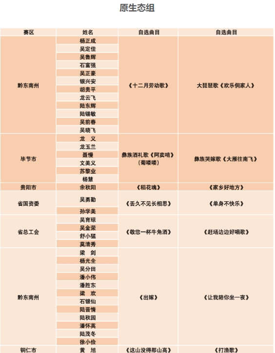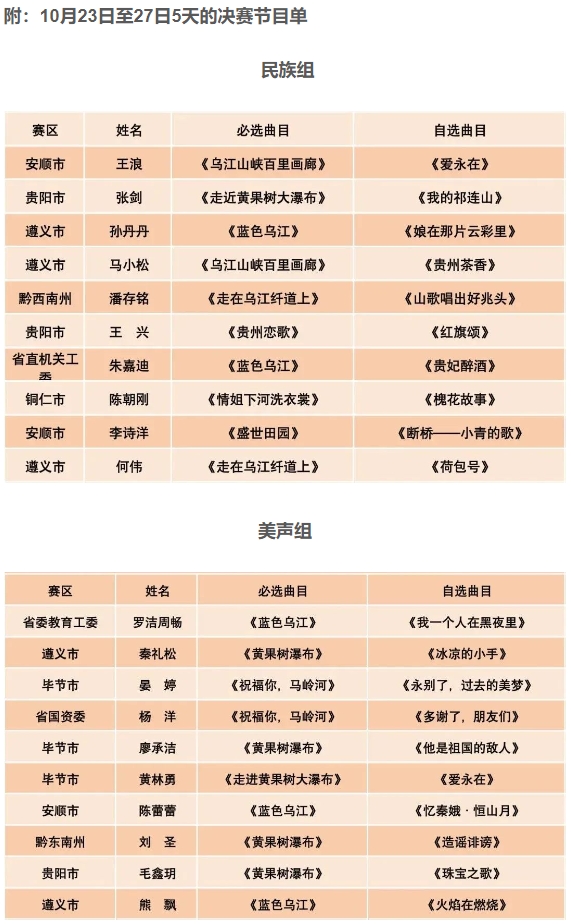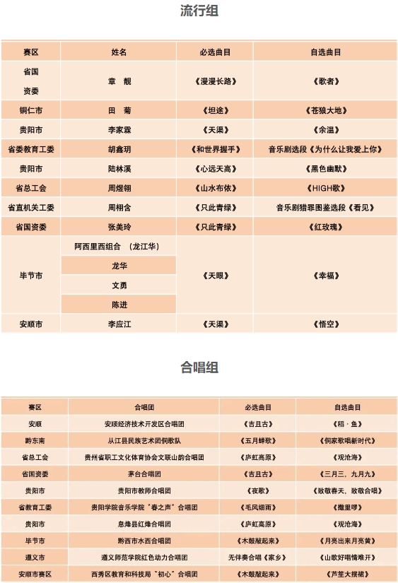 据介绍,本届大赛必选曲目以歌唱贵州之美的音乐为主,组委会为每一种唱法都设定了必选曲目(原生态组除外)。这些歌曲包括《乌江山峡百里画廊》《走近黄果树大瀑布》《盛世田园》《阿仡山寨贵客来》《情姐下河洗衣裳》《走在乌江纤道上》《天眼》等数十首歌曲。其中《情姐下河洗衣裳》《乌江山峡百里画廊》等歌曲曾在央视等多个高端平台上唱响。