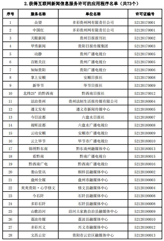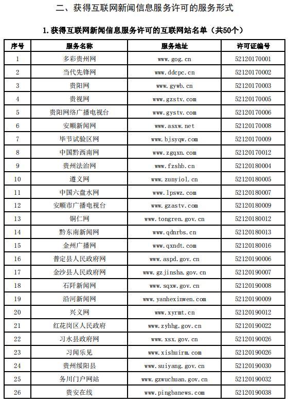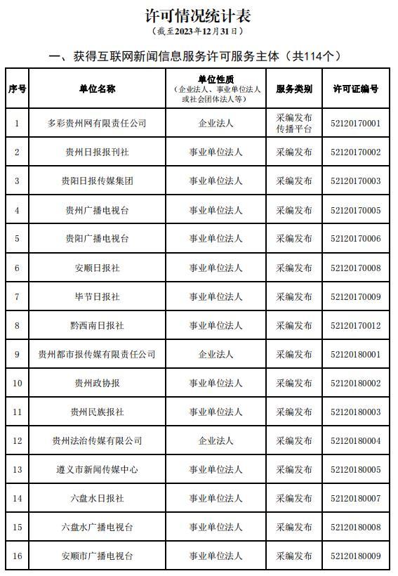 自2017年6月《规定》实施以来,贵州省互联网信息办公室依法组织开展了许可审批相关工作。截至2023年12月31日,经贵州省互联网信息办公室审批的互联网新闻信息服务单位总计114家,具体服务形式包括:互联网站50个,应用程序73个,公众账号263个,共计386个服务项。