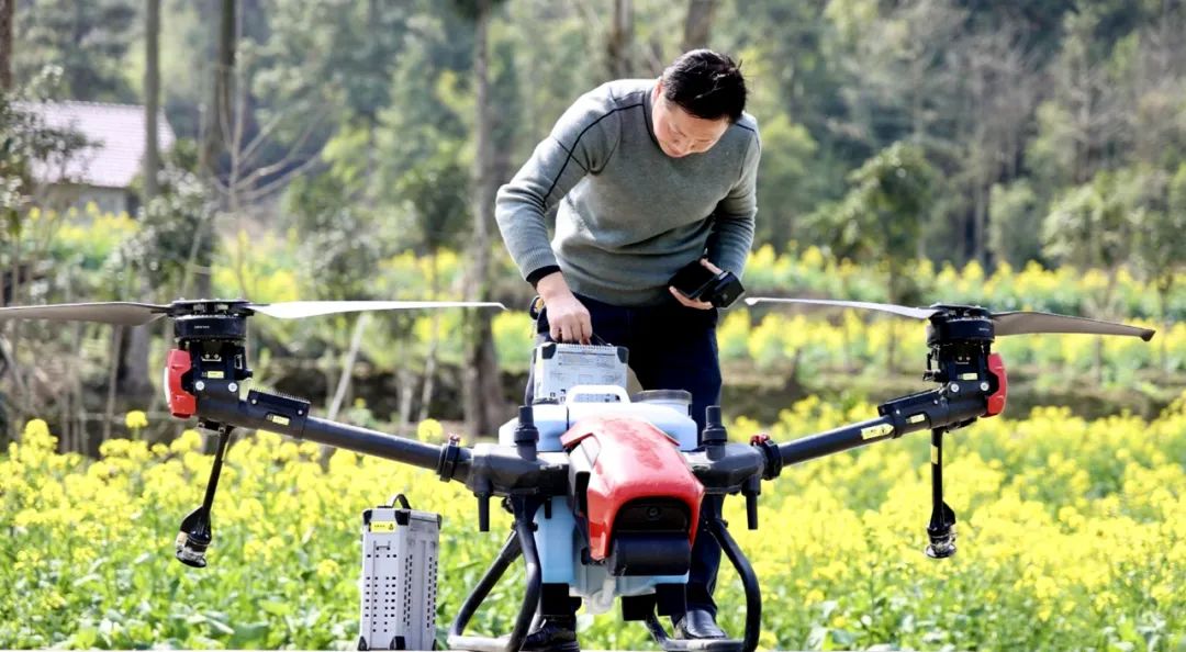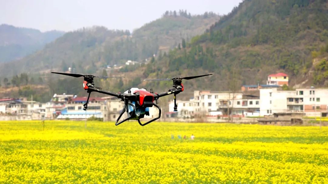 在坝芒乡乐坪村中国好粮油优质稻示范基地,1700亩成片的油菜花花开正盛。伴随着螺旋桨的嗡鸣声,一架植保无人机快速升空,在县农业农村局技术人员的遥控下,向油菜花海喷洒防治病虫害的药液。