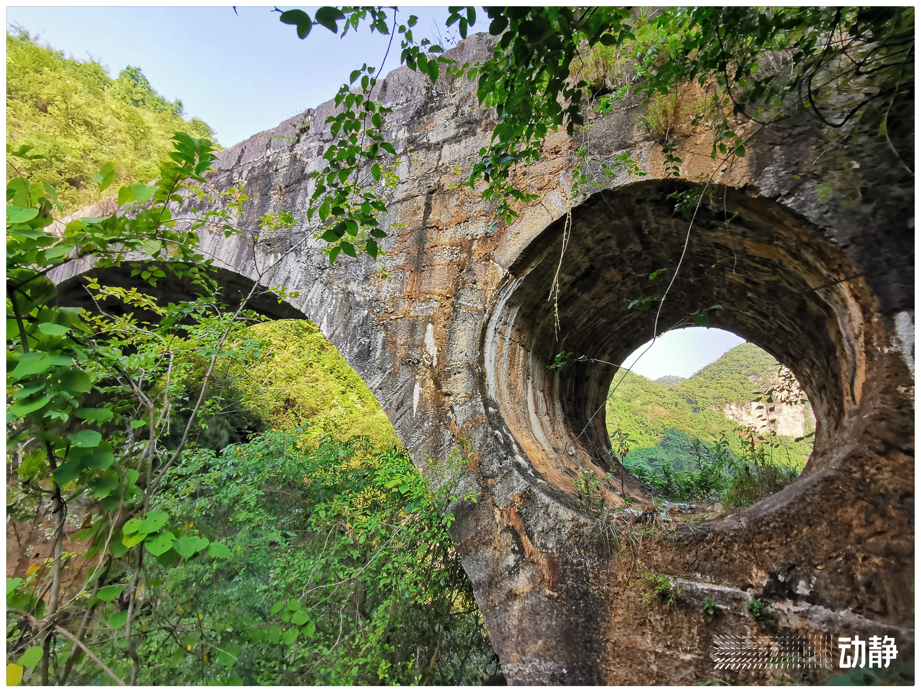我们今天看见的木桥,其实也是刘氏捐资修建的。当年兴义知县胡霖澍梦想能“千秋万代”的石拱桥,最终没有“万世不朽”,同治年间便被冲毁。光绪十九癸巳年(1893),兴义首富刘氏家族捐资倡议,再次修桥。这次修建耗资巨大,尽管依然为单孔石拱桥,但主净跨达到22米。两侧桥肩部位,设置有直径约3米的泄洪孔,这种桥肩部带有泄洪孔的,称为“敞肩”,因此这是一座标准的“单孔敞肩式石拱桥”。同时,为防止桥被水冲毁,还在两侧山坡修筑有专门的护坡泄水渠,渠宽1米以上。桥基更是从原来的位置提升数米,建在山腰,矢高达到37米,非常壮观。除了科学的防洪设施外,风水观念也不能少,在桥心正中的龙门石,镌刻一幅太极图,大概意思就是希望木桥能够以柔克刚,应付凶猛的洪水吧。