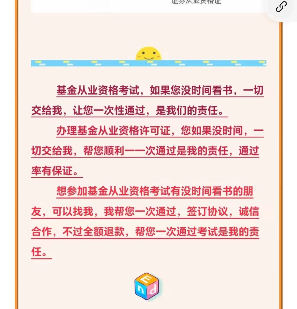 记者近日调查发现,部分基金从业资格考试培训机构在招募考生时宣称,只要缴纳费用即可实现“0学习保过”,“没时间复习不怕,100%通过”“提供考生机位原题”。