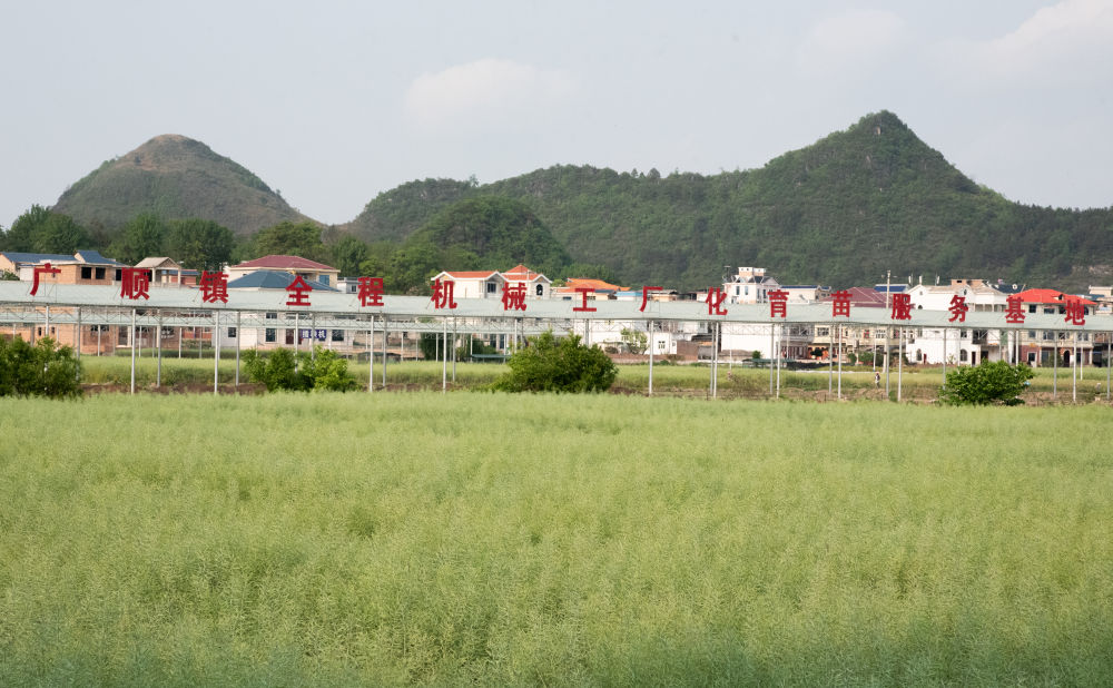 在黔南布依族苗族自治州长顺县广顺镇马路村,自2022年初就开始打造的全程机械工厂化育苗服务基地上,数十名村民正在分工有序地育秧:有的浸泡谷种、有的用钵苗播种机播种、有的在田里摆放已播好种的钵盘、有的在给摆好的钵盘覆盖无纺布……