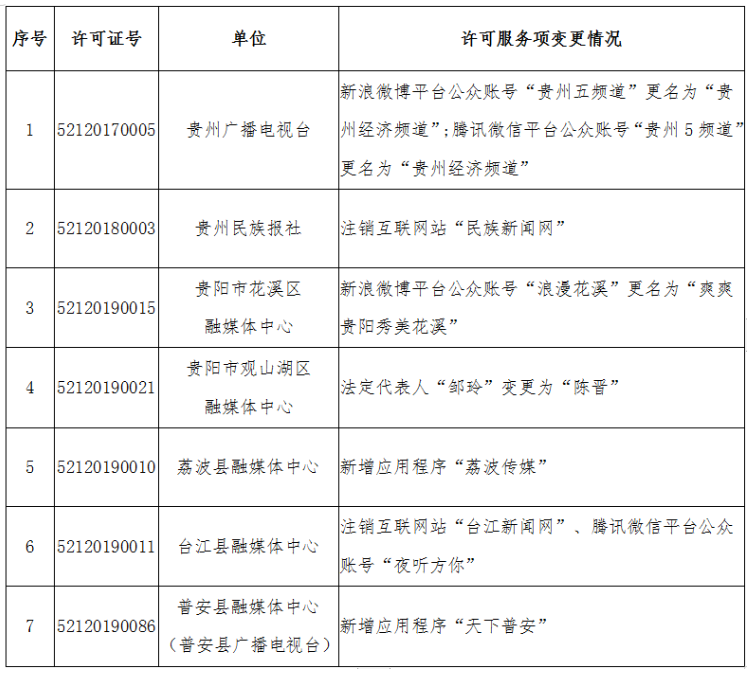 2022年6月,贵州省互联网信息办公室依法组织开展许可审批相关工作,办理相关单位许可服务项变更申请,具体情况如下: