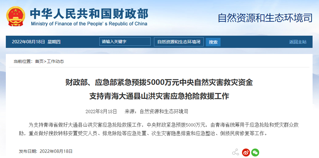 据财政部网站消息,为支持青海省做好大通县山洪灾害应急抢险救援工作,财政部、应急管理部紧急预拨5000万元中央自然灾害救灾资金,由青海省统筹用于应急抢险和受灾群众救助,重点做好搜救转移安置受灾人员、排危除险等应急处置、次生灾害隐患排查和应急整治、倒损民房修复等工作。