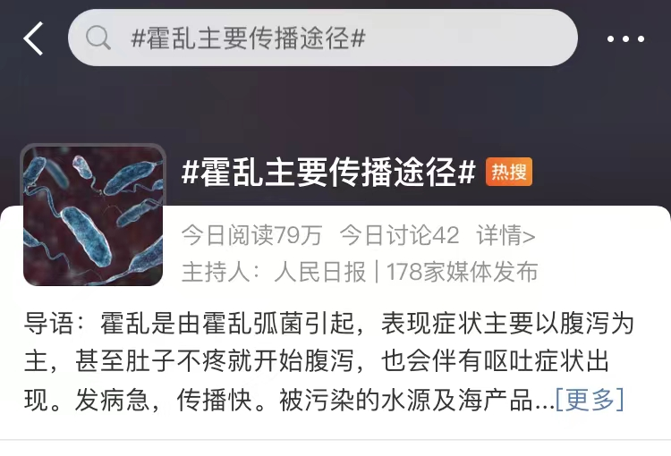 据了解,“霍乱”等肠道传染病主要通过粪—口途径传播,其病原体从病人的粪便、尿液及呕吐物等排出,可污染周围环境,通过被污染的水、食物、手以及苍蝇、蟑螂等媒介传播,病原菌经口腔进入人的胃肠道,在人体内繁殖,产生毒素并引发疾病。
