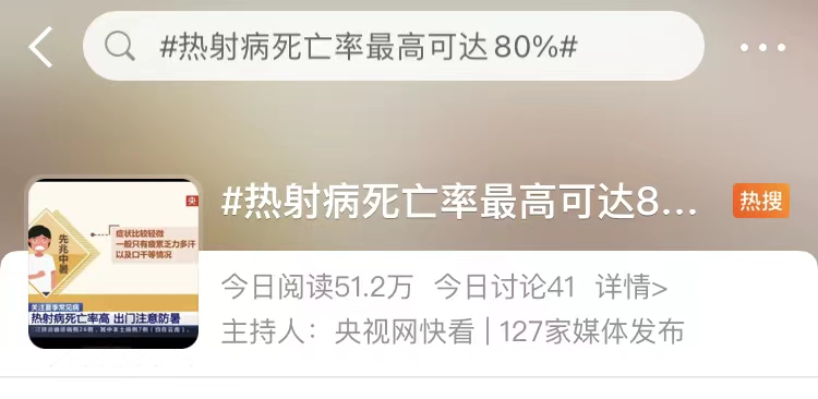 除了“霍乱”等肠道传染病,在夏季疾病中,热射病死亡率最高可达80%。热射病是指因高温引起的人体体温调节功能失调,汗液不能正常排出,导致体内热量过度积蓄,从而引发神经器官受损。热射病在中暑的分级中属于重度,是一种致命性疾病。户外长时间作业人群及老人、儿童、孕妇等都是高危人群。