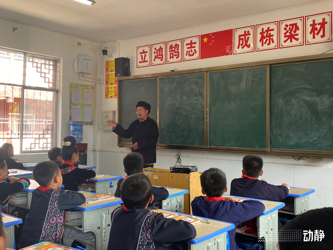 雷山县西江民族小学坐落在西江千户苗寨景区内,校内建筑设计极具苗族风情,学生们学唱苗族歌也是该校的传统课程之一。退休干部杨耀奎是民族文化进校园的苗族歌老师,他说:“我们教唱苗语歌,第一语言是苗语,还要翻成汉语,翻成英语,苗汉英对照,让苗语歌更有生命力。”