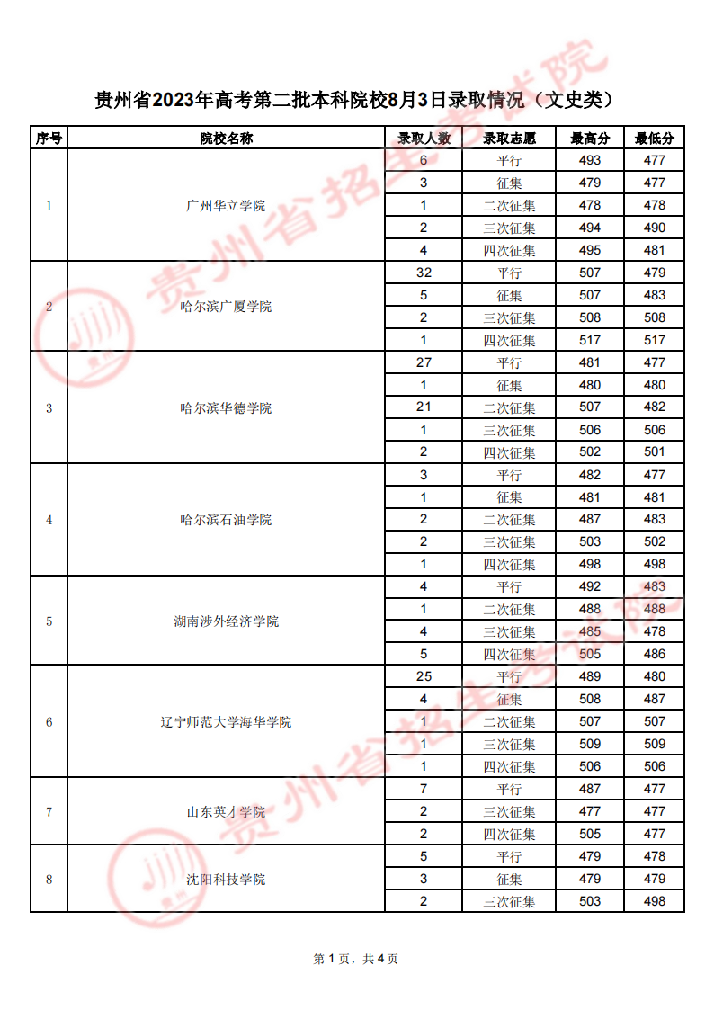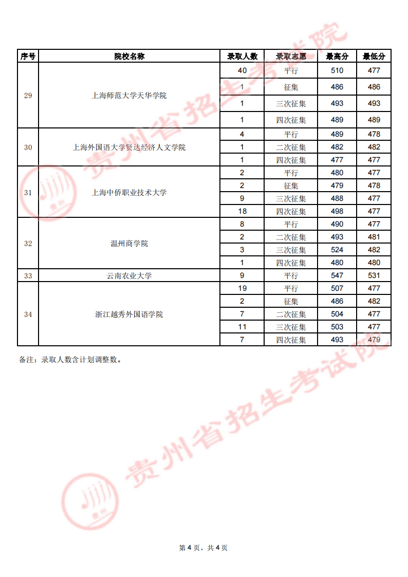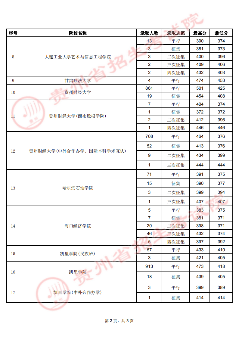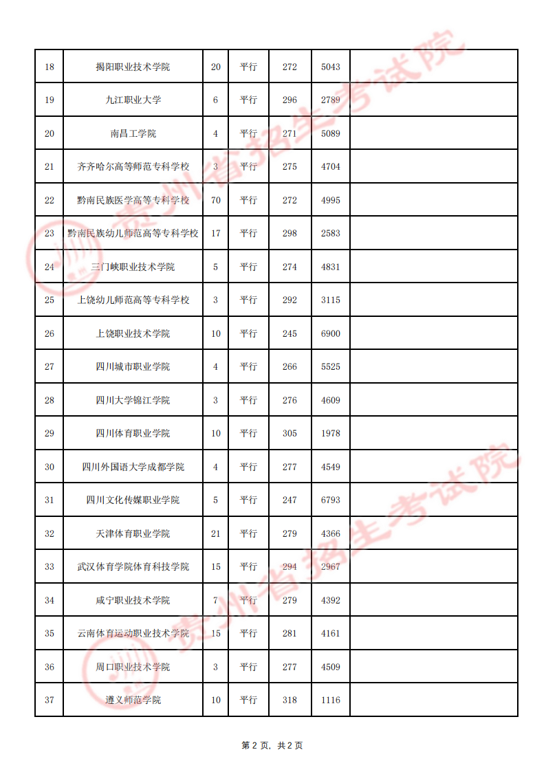 贵州高考二本少数民族预科征集志愿平行投档情况