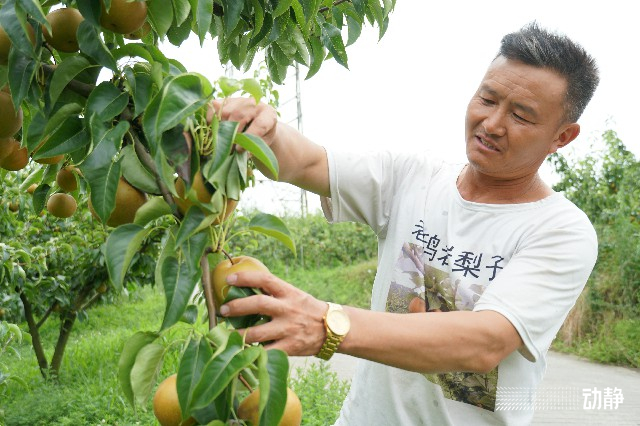 金坝村梨子种植大户石代兵说:“我在老鸹岩这里种这个梨子,种了十七八年了。我种了有30多亩梨子,有20亩杨梅。老鸹岩的这个气候温差大,种出来的水果又甜又脆。 今年的这个梨子长得特别好,马上我们的翠冠、丰水、圆黄、金秋就要上市了,还有另外栽了一部分秋月。目前的销量每天还是卖到了几百斤。”