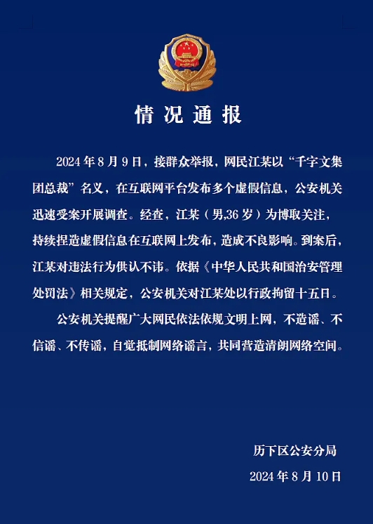 2024年8月9日,接群众举报,网民江某以“千字文集团总裁”名义,在互联网平台发布多个虚假信息,公安机关迅速受案开展调查。