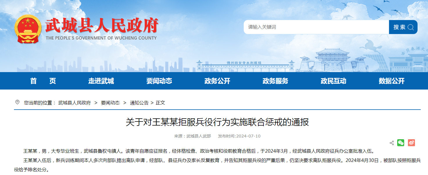 7月10日,山东省德州市武城县人民政府网站发布《关于对王某某拒服兵役行为实施联合惩戒的通报》,全文如下: