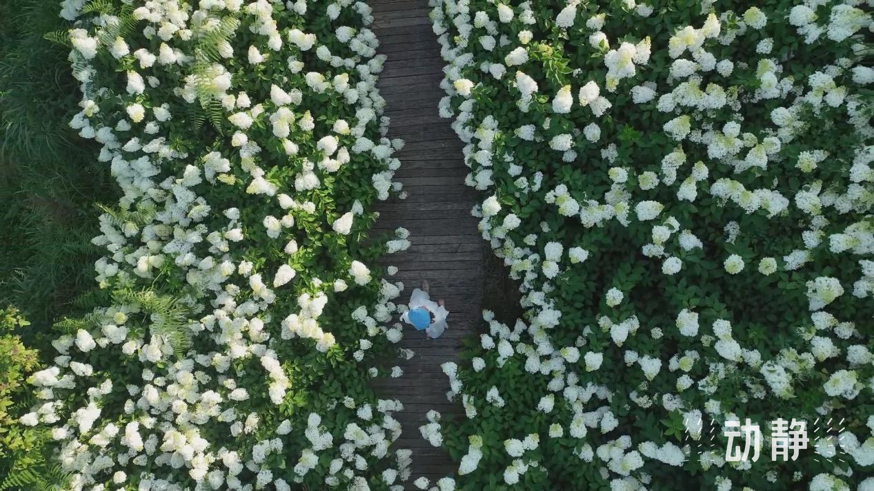 放眼望去,10亩左右的绣球花竞相绽放,白色的绣球花如同雪花般铺满了整个半山坡,微风拂过,花朵摇曳生姿,美不胜收。游客们穿梭在花海中,不时停下来拍照留念,与亲朋好友一起在花丛中尽情享受这悠闲的浪漫时光。