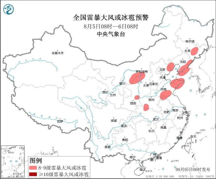 中央气象台8月5日6时继续发布强对流天气蓝色预警: