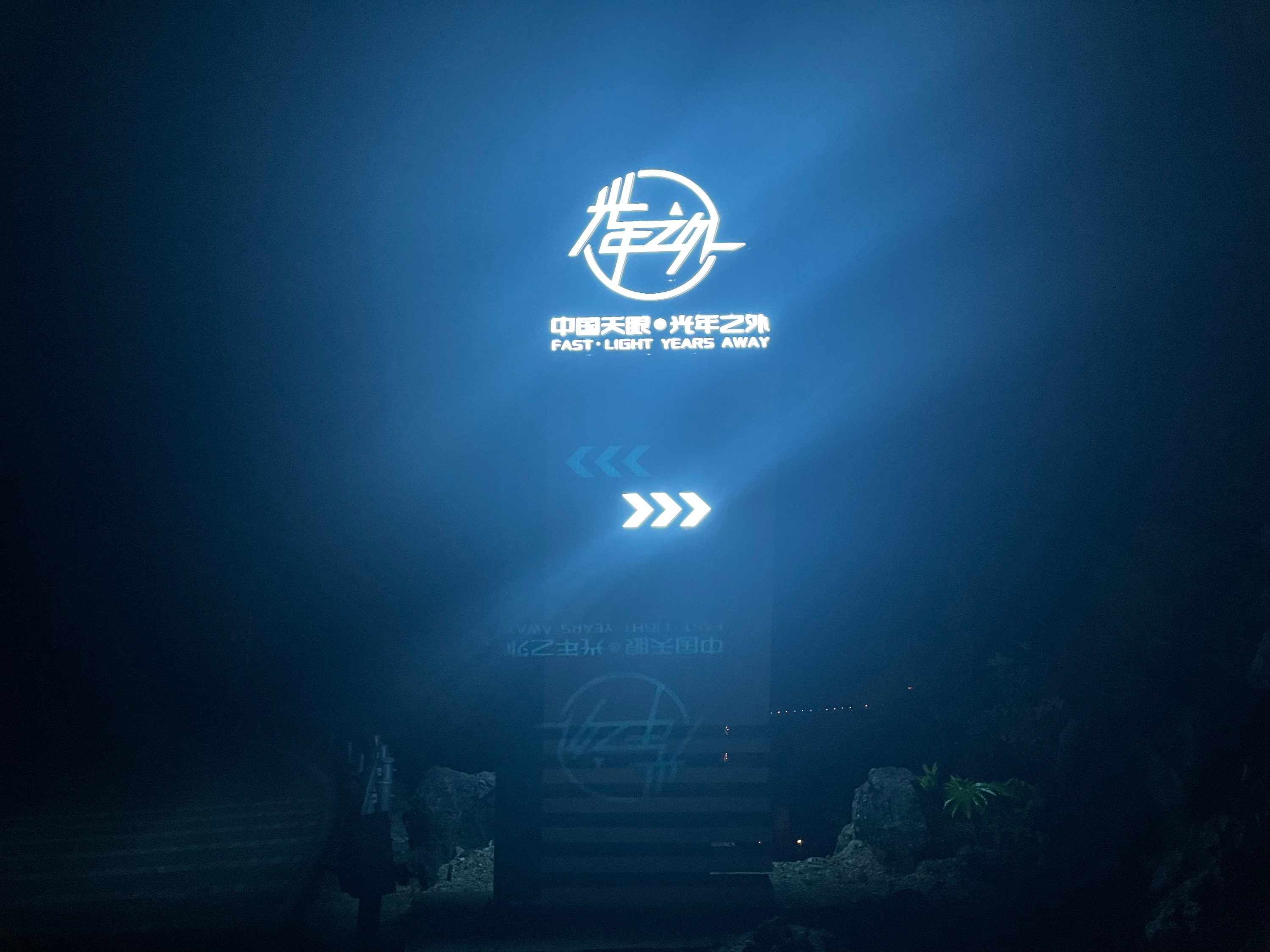 夜幕降临,在通往“天眼”的山路边,“光年之外”四个大字的牌子发出耀眼的光,它外围笼罩着一层蓝色的光雾。它四周,除了黑色的远山,再无其他,幽静得能听见鸟鸣虫唱。偏远山区与前沿科技感在这里相遇,这四个字引发人对浩瀚夜空的无限联想。