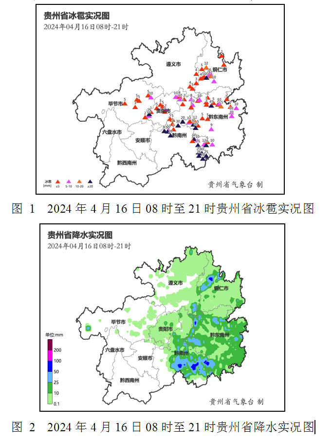 据省气象台消息,4月16日08时至21时,黔东南州三穗、丹寨、凯里、台江、天柱、施秉、榕江、锦屏、镇远、麻江、黄平,黔南州三都、惠水、独山、瓮安、福泉、荔波、贵定、龙里,贵阳市乌当、修文、开阳、息烽、清镇、白云、花溪,遵义市余庆、凤冈,铜仁市印江、思南、松桃、玉屏,毕节市大方、织金、黔西共35个县(市、区)境内降冰雹,最大冰雹直径为施秉县牛大场55毫米;50站出现8级以上大风,最大风速为黎平县尚重岑埂27米/秒(10级)。暴雨出现在沿河、三都、威宁、榕江、德江、黄平、独山、平塘、印江共9县域内的17个观测站,最大雨量为榕江县兴华星光74.2毫米,大雨有155个观测站,中雨有439个观测站,中雨及以上降水主要出现在遵义市东南部、铜仁市北部和东南部、黔南州中东部、黔东南州大部、贵阳市北部、毕节市西部边缘;东部地区有32个县(市)域内出现150站次短时强降水,小时雨强最大为独山县水岩65.8毫米(16日19时至20时)。
