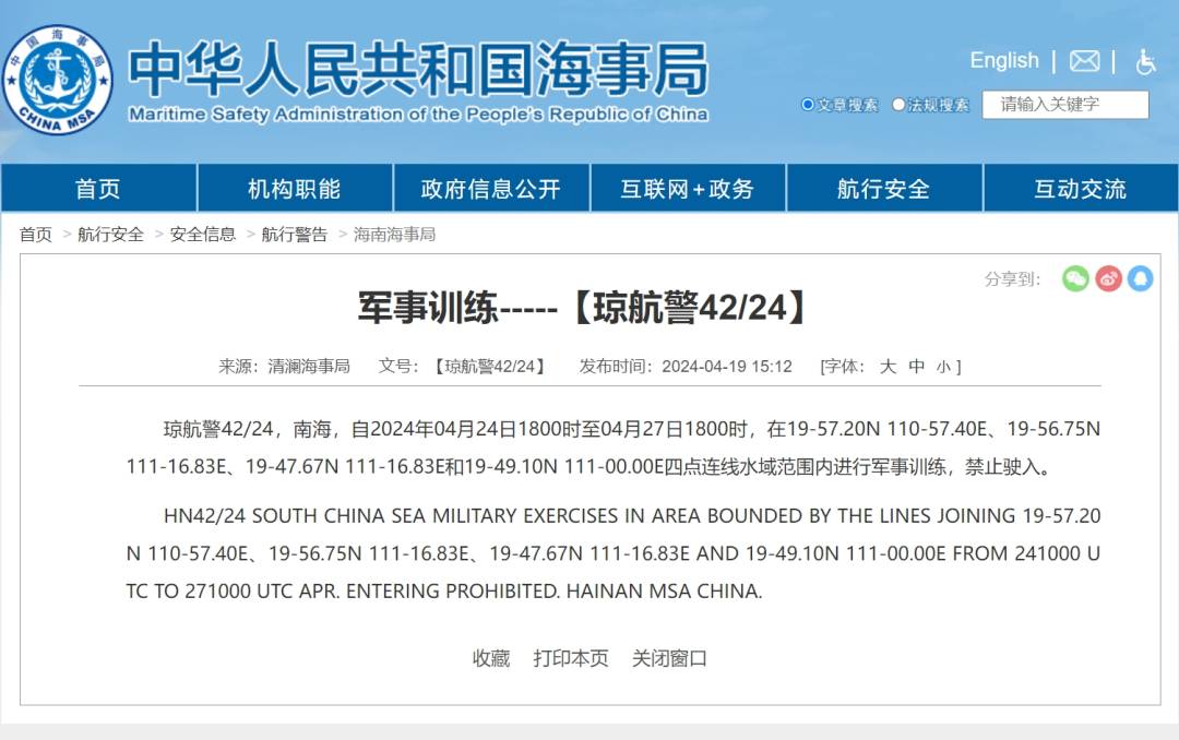 清澜海事局发布航行警告,4月24日18时至4月27日18时,南海部分海域进行军事训练,禁止驶入。
