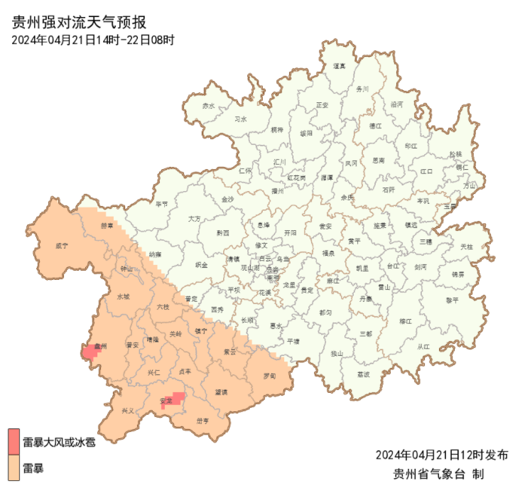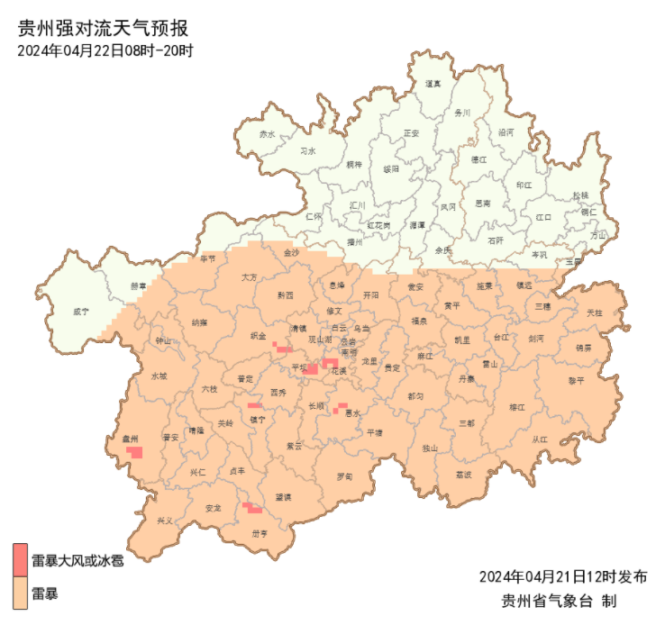 21日14时至22日08时,省的西部地区有雷电,局地伴有冰雹、大风等强对流天气;22日14时至20时,省的中南部地区有雷电,局地伴有冰雹、大风等强对流天气。