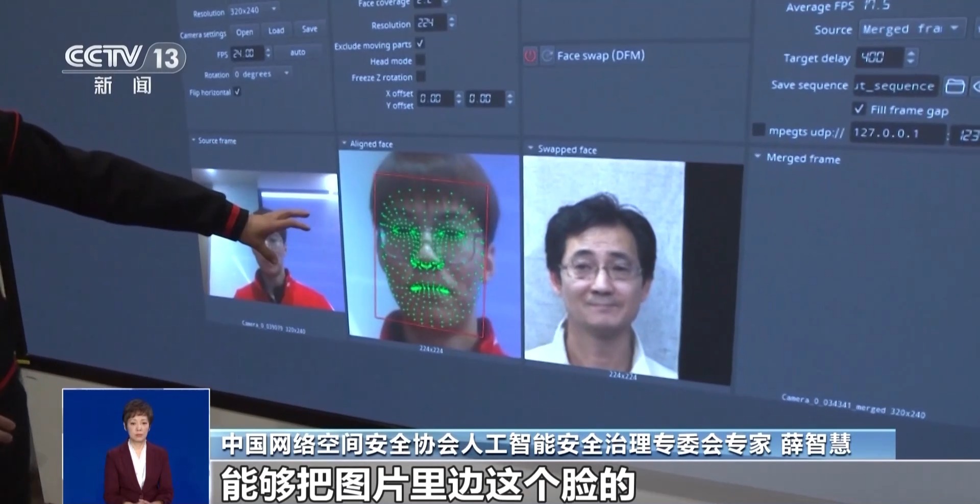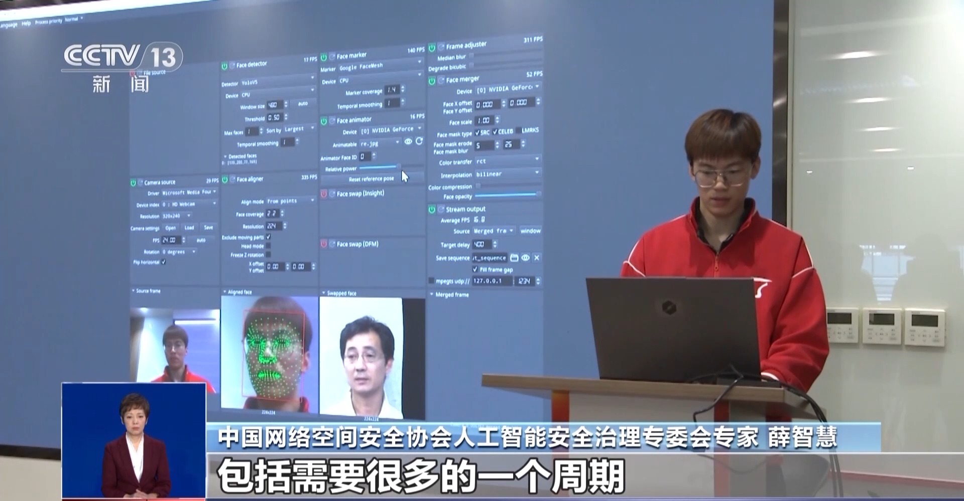 中国网络空间安全协会人工智能安全治理专委会专家 薛智慧:如果要实时点对点交流的话,需要再采集更多的照片,完了进行深度学习算法模型的训练,训练出来这个模型以后灌到咱们这个视频里去,就可以做实时的变化跟转换了。这种情况下,就可以做到实时的变脸。声音的交流也可以,需要预先采集一些咱们目标人群当中的声音,然后进行模型的训练,能够把目标人群的声音还原出来。