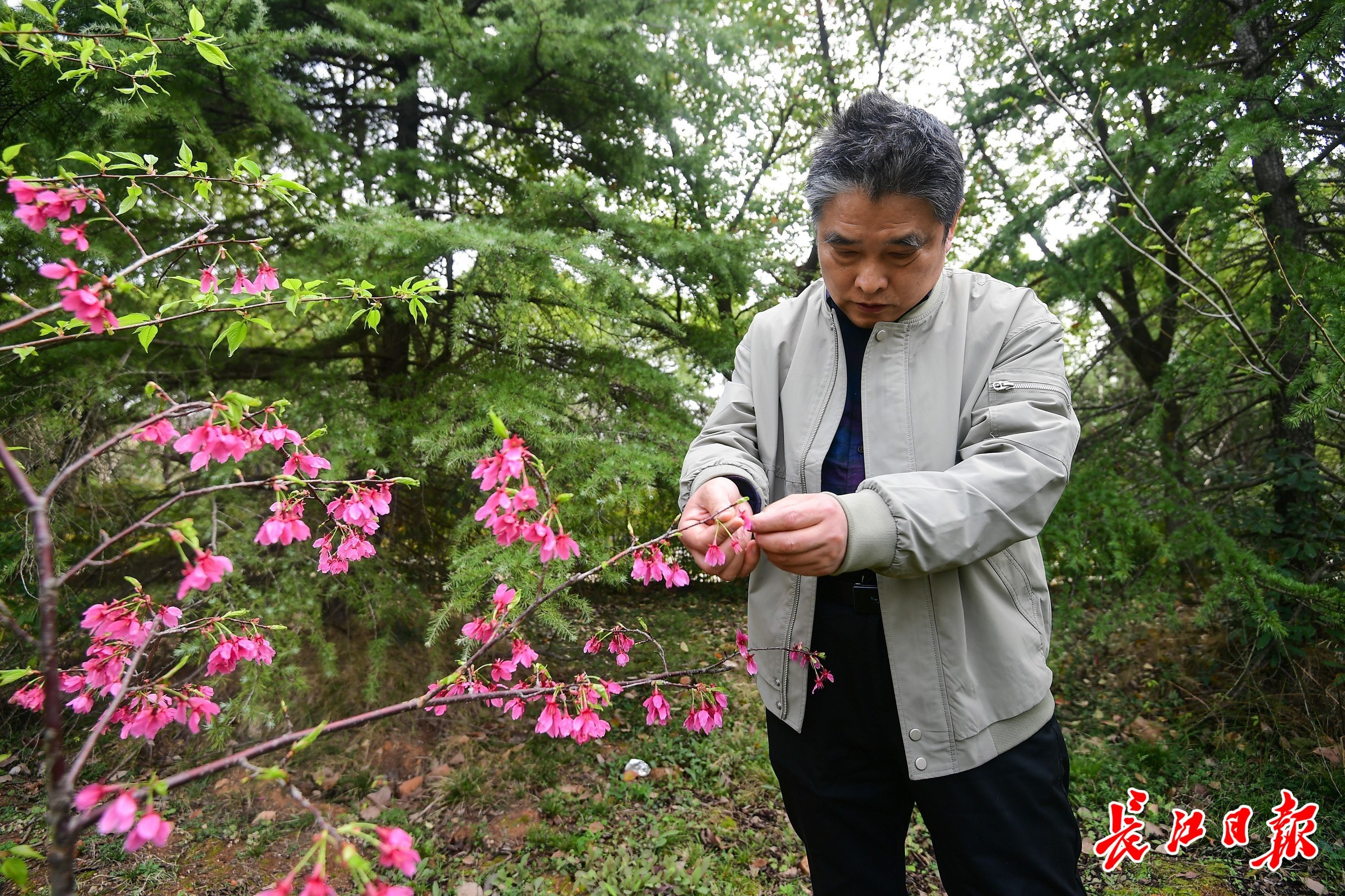 吉野樱开得正旺,福建山樱已近凋谢,华中樱“花果同现”,而关山樱还毫无动静……“这是一株福建山樱和华中樱的杂交种,它的特点是开花早,花色红,花蕾稍下垂。”蒋细旺如数家珍。